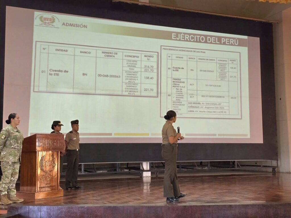 El Instituto de Educación Superior Tecnológico Público del Ejército «Sgto 2do Fernando Lores Tenazoa», recibió a 140 Soldados del Servicio Militar Voluntario y Personal de Reenganchados de diferentes sedes del Comando de Educación y Doctrina del Ejército (COEDE). En una sesión de inducción realizada en el auditorio de esta magna casa de estudios, se les motivó a considerar esta prestigiosa institución militar como opción para su formación técnica profesional.