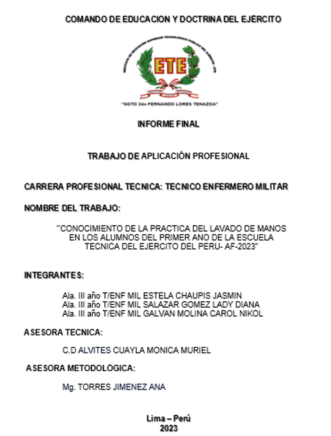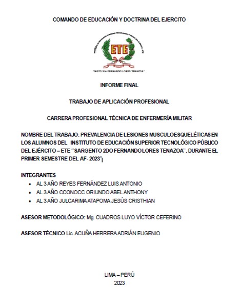 En el presente trabajo de aplicación se realizó el estudio para determinar cuál es la prevalencia de las lesiones musculo esqueléticas que se presentan en los alumnos del Instituto de Educación Superior Tecnológico Público del Ejército – ETE “Sargento 2do Fernando Lores Tenazoa” en los alumnos de 1er año, 2do año y 3er año que conforman el batallón de alumnos, registrados en los efectivos de los respectivos años, de los diversos años de la Escuela Técnica del Ejército. Determinar la prevalencia de lesiones músculo esqueléticas …