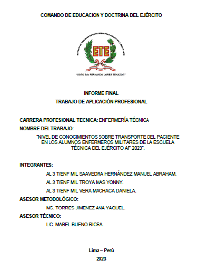 El presente trabajo tiene como objetivo general demostrar el nivel de conocimiento de los métodos de transporte del paciente que tienen los alumnos Enfermeros Militares de la Escuela Técnica del Ejército y dar a conocer los diversos tipos de métodos de transporte de pacientes, así como inmovilizaciones de pacientes y evacuaciones aeromédicas de pacientes. Lograr que cada alumno al egresar pueda realizar de la manera correcta el traslado de pacientes ya que en su mayoría de enfermeros los sub oficiales al egresar son …