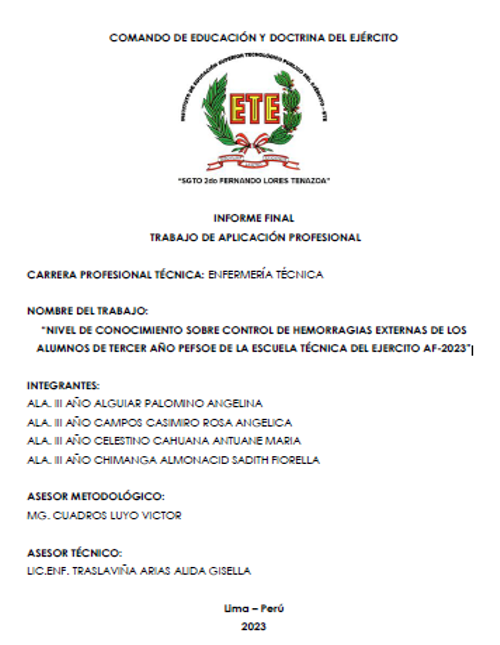 Este trabajo aplicativo profesional tiene como objetivo comprobar el nivel de conocimiento sobre control de hemorragias externas en los alumnos de tercer año PEFSOE de la Escuela Técnica del Ejército AF-2023 . En la actualidad las hemorragias externas son unas de las principales causas de la muerte por ello la interrogante ¿Cuál es el nivel de conocimiento sobre control de hemorragias externas en los alumnos de tercer año PEFSOE de la Escuela…