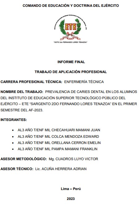En el presente trabajo de aplicación se realizó el estudio sobre la prevalencia de caries en los alumnos del Instituto de Educación Superior Tecnológico Público del Ejército – ETE “Sargento 2do Fernando Lores Tenazoa”, La población estuvo constituida por 1,179 alumnos de 1er año, 2do año y 3er año alumnos que conforman el batallón, registrados en los efectivos de los respectivos años. Objetivo: Determinar la prevalencia de caries en los alumnos del Instituto de Educación Superior Tecnológico Público del Ejército – ETE “Sgto. 2do Fernando Lores …