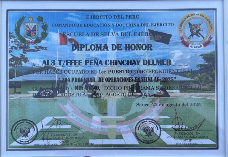 La Escuela Técnica del Ejército “Sgto. 2do Fernando Lores Tenazoa” felicita al AL3 T/FFEE Peña Chinchay Delmer, quien ha obtenido el primer puesto en el 2do Programa de Operaciones en Selva AF – 2025, desarrollado en la Escuela de Selva del Ejército.